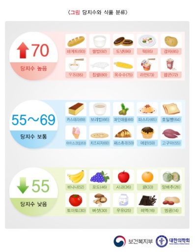 GI 50 이하이면 저혈당 식품으로, GI 70 이상이면 고혈당 식품으로 분류하는데요. 주로 각종 채소 과일은 저혈당 식품군에 속하고, 백미, 빵과 같은 탄수화물 음식들은 고혈당 식품군에 속합니다. 그러나 같은 과일이라도 사과는 혈당 지수 36에 불과한 반면 여름에 많이 먹는 수박은 혈당지수 60으로 상대적으로 높은 편에 속합니다. 칼로리가 비교적 낮은 쌀밥은 92로 혈당지수가 아주 높지만 소고기는 혈당지수 46으로 칼로리에 비해 혈당지수는 낮은 편에 속합니다