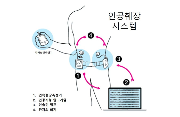 인슐린을 생산하지 못하는 당뇨병 환자는 물론 유병기간이 오래되어 매일 인슐린 주사를 수 회씩 주입하는 것은 환자에게 상당한 부담이 됩니다. 이런 부분을 해결하기 위해 오랫동안 연구되어 온 부분이 바로 췌장이식이었습니다. 간이나 신장처럼 뇌사자의 췌장을 이식받거나 살아있는 공여자의 췌장을 이식하는 방법이었는데, 이식 이후 거부반응 등의 부작용으로 큰 성공을 이루지 못했습니다. 그러나 현대 의료기술과 과학 기술의 발전으로 생체물질이 췌장을 대체하지 못하면 기계가 이를 대신하도록 하는 '인공췌장시스템'이 개발되어으며, 이는 체내의 포도당 농도를 감지하고 이에 따라 자동으로 인슐린을 체내에 주입하는 기기입니다. 인공췌장이란 연속혈당측정기, 인슐린 펌프, 그리고 인공지능 알고리즘의 세 가지 부분으로 이루어져 있습니다. 지금까지 설명한 장치들을 일종의 인공지능으로 연결한 것이라 생각하면 됩니다.