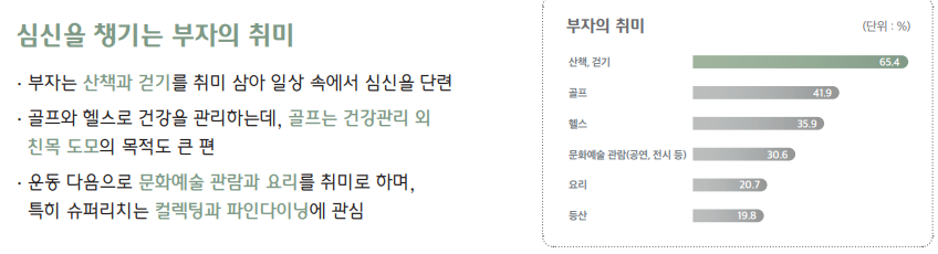 금융기관에서 나오는 웰스리포트는 부자들의 생활습관, 관심사항, 인사이트 등을 알 수 있는 좋은 자료입니다. 막연히 부자가 되는 상상을 하는 것이 아니라 부자의 마인드과 생활 습관 등을 모두 따라하는 것은 아니지만, 어떤 방향성과 목적성을 어디에 두는지를 보는 것은 자신의 인생을 행복하고 부를 늘릴 수 있는 나침반 역할을 할 수 있습니다. 한번 읽어보시면 좋겠습니다.