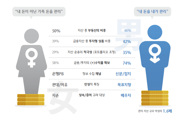 재미있는 분석도 내놨습니다. 자산가들중 남녀의 자산관리를 분석한 자료를 보면 다음과 같습니다.