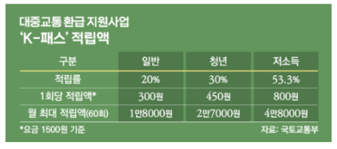 환급시스템은 이용자에 한해서 사후에 환급되며, 환급비율은 최소 20%(일반인) ~ 최대 53%(저소득층)되며, 월 최대 60번까지 사용한 금액의 일부를 돌려줍니다. 전국 어디서든 사용이 가능합니다.